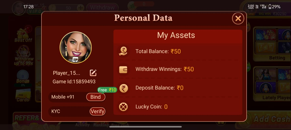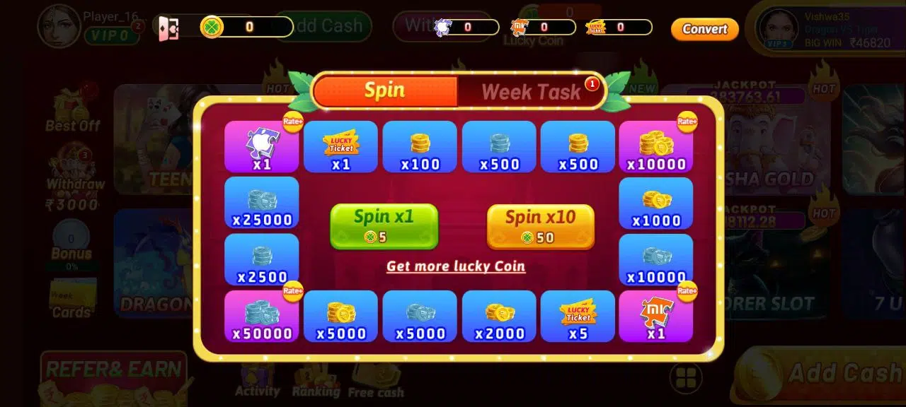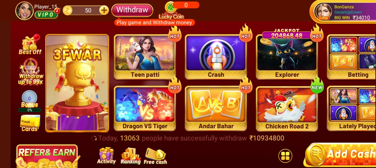 Play Games Bonus You can earn various bonus rewards by playing games and participating in in-game tasks. For example: Complete daily missions to earn up to ₹500 or more. / Participate in VIP tasks and events for extra bonus opportunities. / VIP players receive additional cashback and game task bonuses (up to ₹1000+ per level).