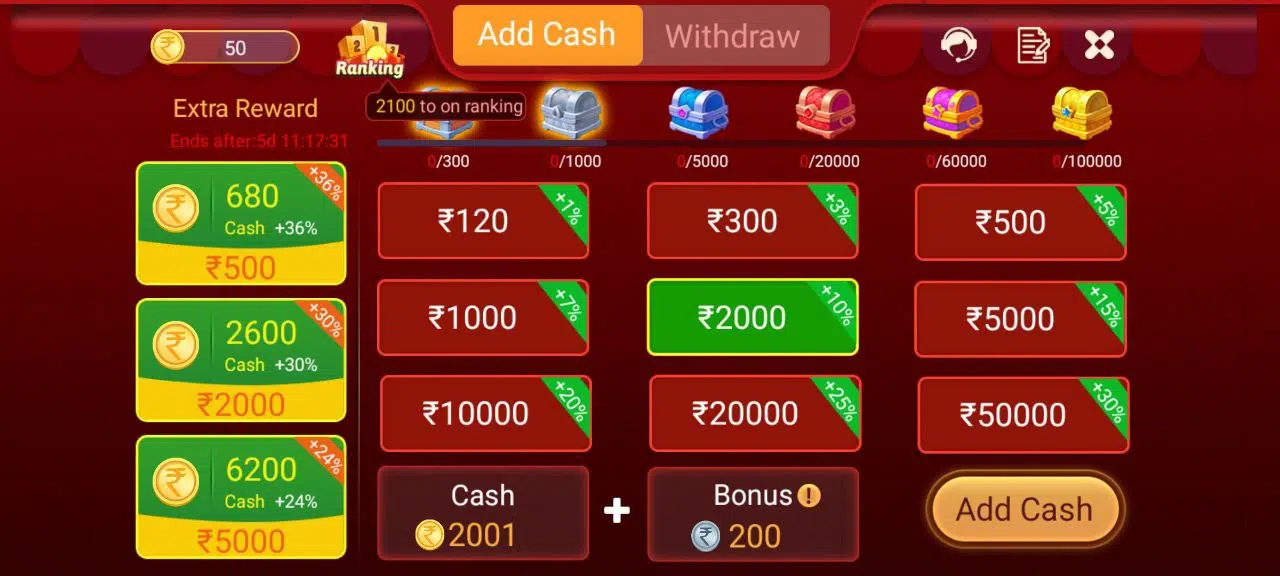 Recharge Cashback Bonus Recharge offers come with generous bonus returns: ₹120 recharge = ₹240 total (₹120 bonus) / ₹500 recharge = ₹1500 total (₹1000 bonus) / ₹1000 recharge = ₹3500 total (₹2500 bonus) / ₹5000 recharge = ₹20000 total (₹15000 bonus) The more you recharge, the higher the bonus you receive.